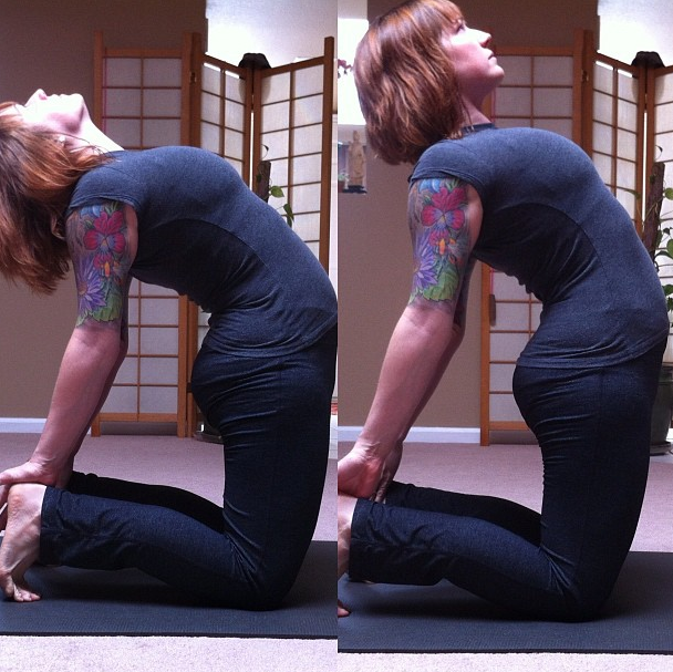 The photo on the left is how you normally see this pose done. The photo on the right is actually the proper alignment. You will feel the difference when you support your neck and align your palate (the top of your mouth). Hold in your core and tuck your tailbone. You must engage your muscles don’t just let go in the pose, be strong. If you want neck problems when you’re older go ahead and don’t support your neck. When your neck is happy your lower back will be happy too. You can see my lower back is arching way too much on the left and I’m losing stability in the lumbar area. Over arching your spine is never a good idea! Only do one arm at a time if using both arms is too intense.