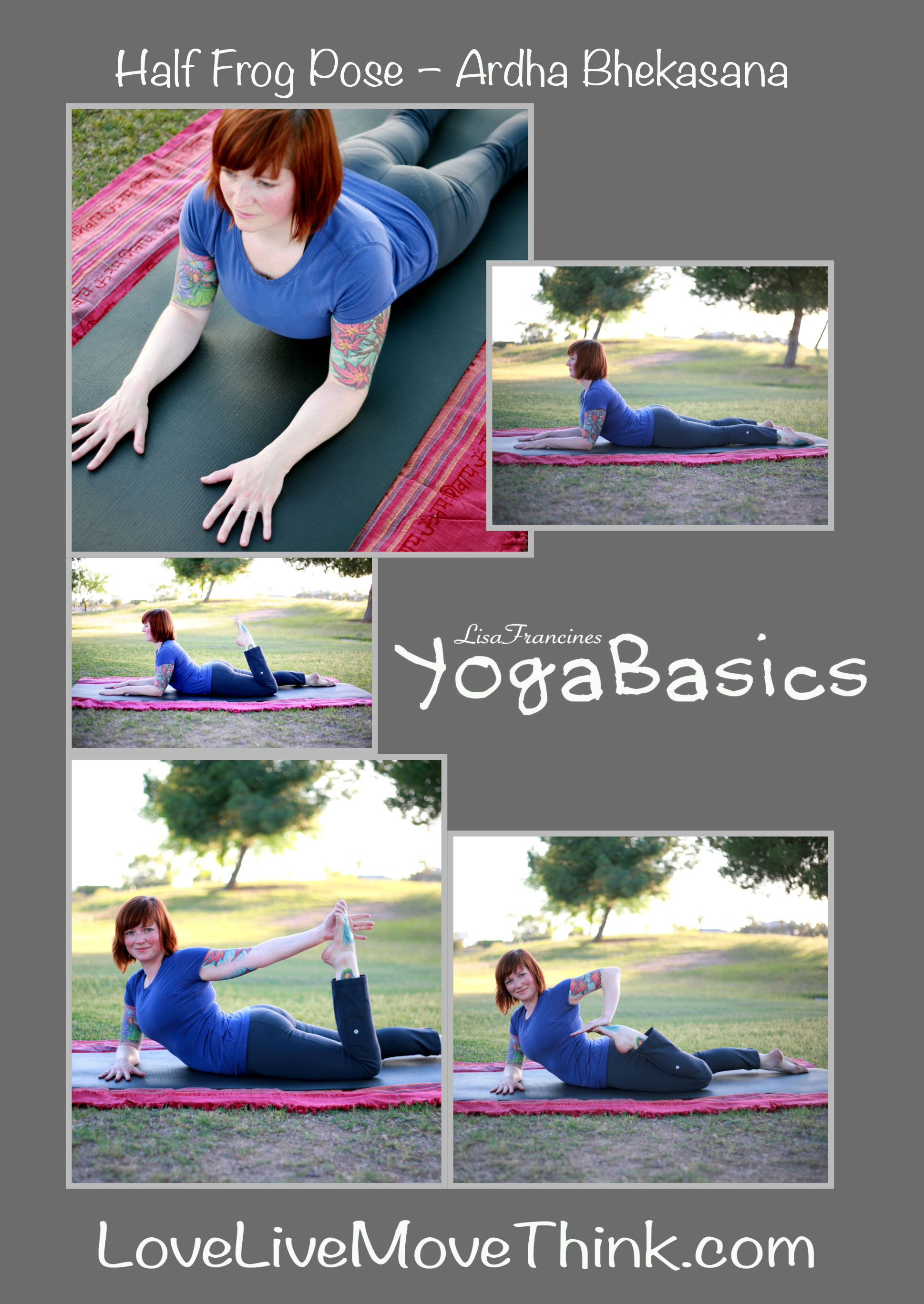 Sphinx Pose (Salamba Bhujangasana) to Half Frog Pose (Ardha Bhekasana). As you can see in the pictures this is a great opportunity for a chest stretch. Grab your foot from inside your arch and press your leg away from your body. This will pull on your arm and create an excellent chest opener. You’ve got to open up your heart! Then the next step is to start bending your elbow and bring your foot toward you. This then becomes a great Quadriceps Stretch. WAY safer than trying to stand up and do it.